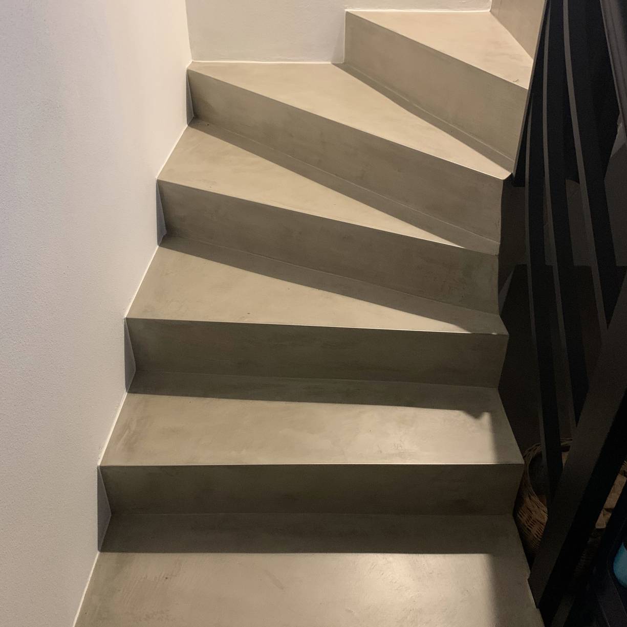 Leistung: Hier wurde die ganze Bodenfläche und Treppe mit Beton Floor in 3 Arbeitsgängen gespachtelt. Dieses verfahren ermöglicht abgesehen von der Materialstärke von nur 2mm eine individuelle und einzigartige Looftoptik. Hier wurde auch auf Sockelleisten verzichtet um den Industrielook noch zu verstärken.